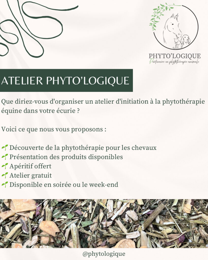 s ateliers d’initiation à la phytothérapie équine. Autour d’un moment convivial je me déplace au sein de vos écuries pour vous apprendre les différentes possibilités d’utilisation de la phytothérapie et en profite pour vous présenter les différents produits disponibles à la vente autour d’un apéritif offert.